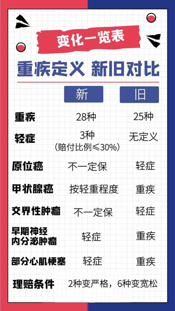 新定義將法定重疾從原來的25種擴展到了28種,重疾新規里,理賠變寬松的有 6 種,理賠變嚴格的有2種。
